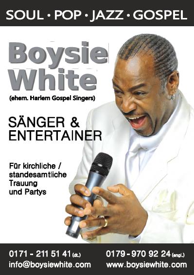 Erleben Sie Boysie White live und hautnah und besprechen Sie mit uns Ihre musikalischen Wünsche bei Ihrer Trauung und Hochzeitsparty. Eintritt frei.