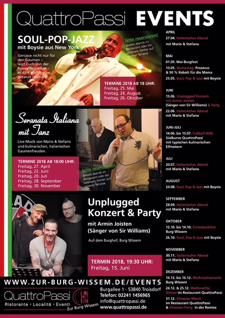 25.05.2018: Soul-Pop-Jazz im Quattro Passi zur Burg Wissem in TroisdorfUhrzeit: ab 19:00 UhrReservierungen unter: 02241 / 1456965www.zur-burg-wissem.de/quattropassi/