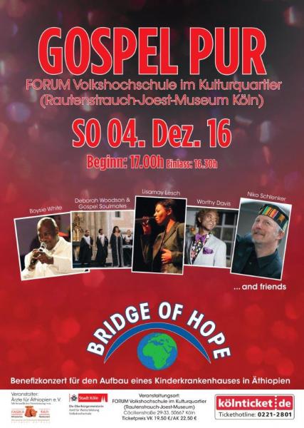 04.12.2016: Gospelkonzert in KölnUhrzeit: 17:00UhrMitwirkende Künstler: Boysie White, Deborah Woodson & Gospel Soulmates, Worthy Davis, Niko Schlenker.